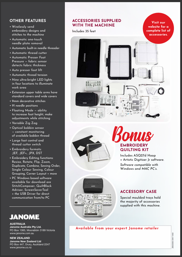 UPGRADE Artistic Digitizer JR to Full version PN 202410009 $1,149 1 x Janome USB Stick 4GB PN JANUSBKEY $20 1835 Embroidery Designs FREE Download $399 BONUS Embroidery Kit packaged in embroidery unit carton (Artistic Digitizer JR & ASQ27 Hoop) $1,399 Plus 5 FREE Janome Apps: AcuAssist, Embroidery-Link, AcuSetter, AcuSketch, ScreenSaverTool (available on Google Play & App Store) TOTAL BONUS VALUE $2,967+